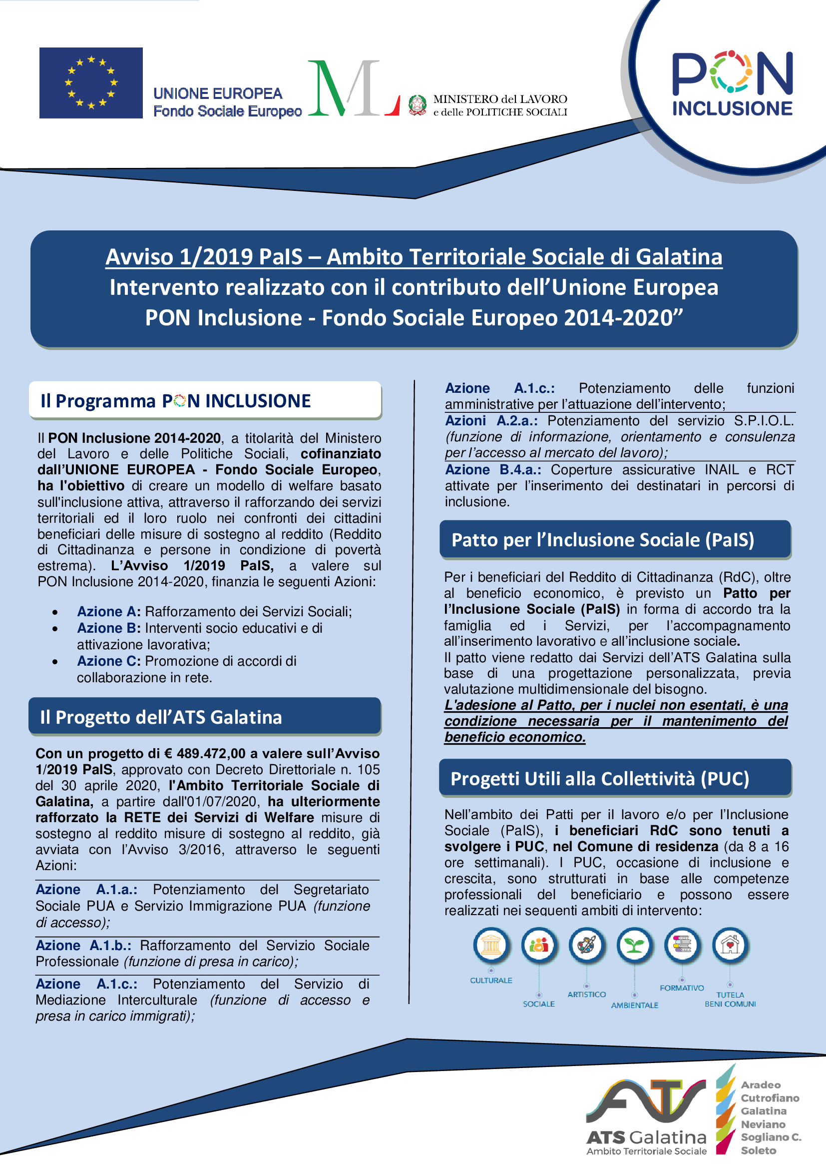 L’Ambito Territoriale Sociale di Galatina con una proposta progettuale d’intervento in risposta all’Avviso pubblico di cui sopra, approvata con Decreto Direttoriale n. 105 del 30 aprile 2020 per un importo pari ad € 489.472,00, a partire dall’01/07/2020 ha ulteriormente rafforzato la Rete di Welfare dedicata alla gestione del Reddito di Cittadinanza già avviata con l’Avviso 3/2016, attraverso le seguenti Azioni: